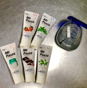 このMIペーストは、健康な歯に必要なミネラル(カルシウム、リン)や、CPP-ACP(リカルデントと呼ばれるもの)が含まれています。これらの成分は、虫歯の予防だけでなく、ホワイトニング後の知覚過敏防止にもなるんです!