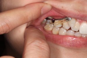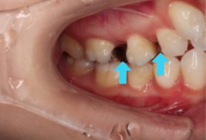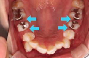 ちなみに、わたしは犬歯と奥歯との間の長さが長すぎたので、右側は銀色の装置でしたが、左側は下の写真のように透明な装置で付けることができました。ほとんどの場合は透明な装置で可能なようです。